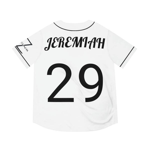On the front you will find IT IS WRITTEN, on the side the scripture right out of the bible, and on the back you will find Jeremiah on the top and 29 on the bottom reflecting an actual baseball jersey.